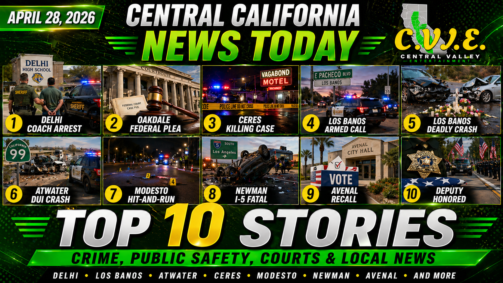 Today’s roundup covers a Merced County coach arrest, an Oakdale federal child exploitation case, a Ceres motel killing court update, a Los Banos armed-subject investigation, a deadly Los Banos crash, a wrong-way DUI crash near Atwater, a Modesto hit-and-run death, an I-5 crash near Newman, an Avenal recall election dispute, and the funeral for fallen Tulare County Deputy Randy Hoppert.